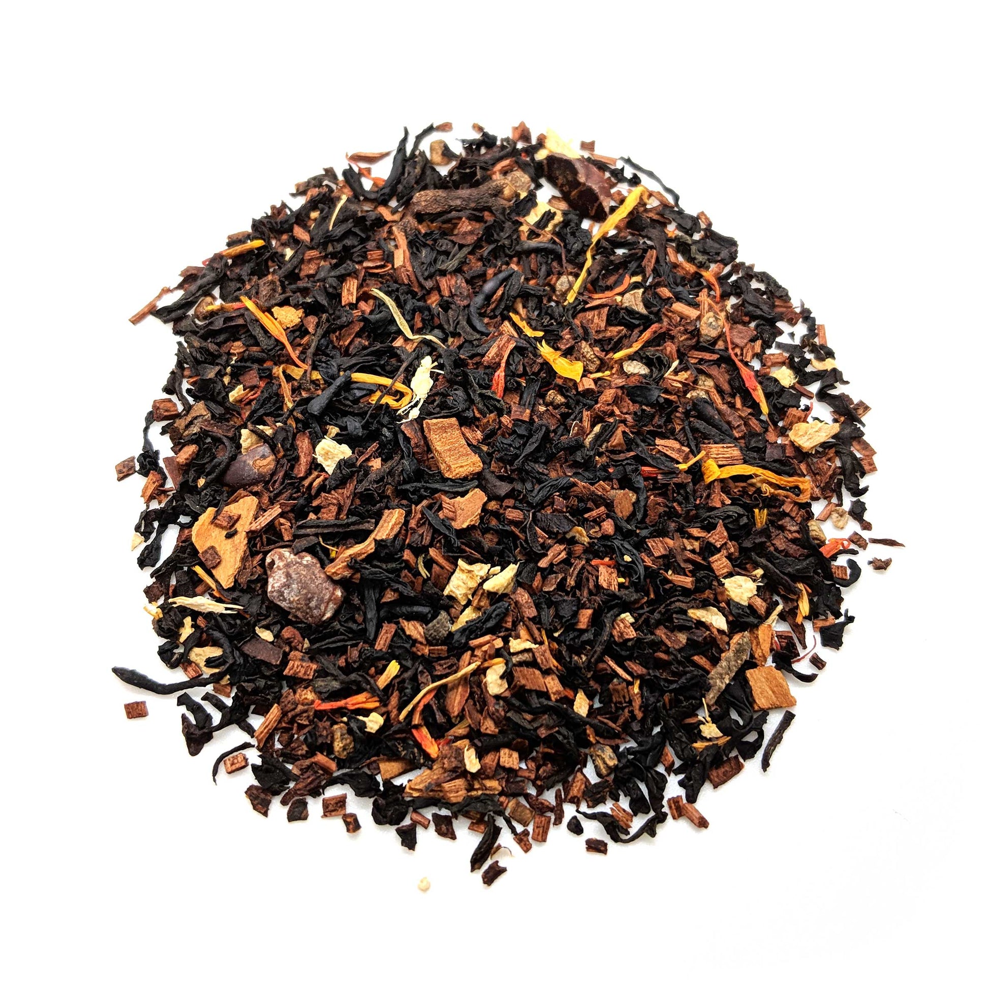 Blended with: Black Tea, Honeybush Tea, Cinnamon Bark, Natural Pumpkin Spice Flavor, Ginger Root, Cloves, Cocoa Nibs, Marigold Flowers, Cardamom, Red Peppercorns, Natural Pumpkin Spice Flavor And Safflower