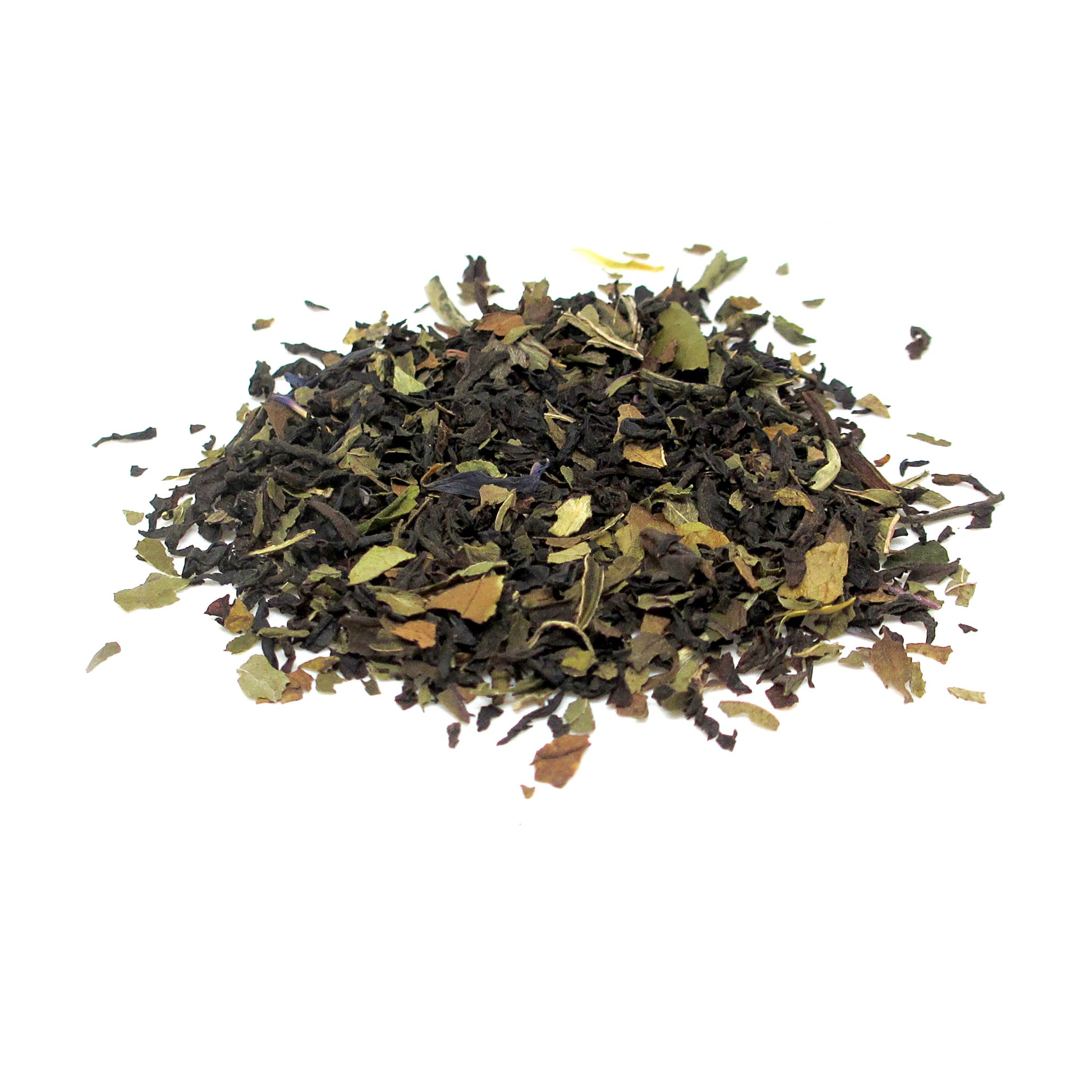 Blended with: Black Tea, Peppermint, Orange, White Tea, Natural Bergamot Flavor, Blueberries, Natural Blueberry Flavor, Natural Blackberry Flavor, Raspberry Leaves, Blue Cornflowers