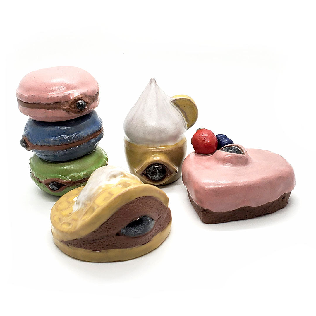 Sizes: Heart cake and waffle are just over 2 inches wide and 1.5 inches tall at highest points. Macaron stack has a base of about 1.5 inches and stands almost 3 inches tall. Lemon tart is also about 1.5 inches wide and stands about 2.5 inches tall.